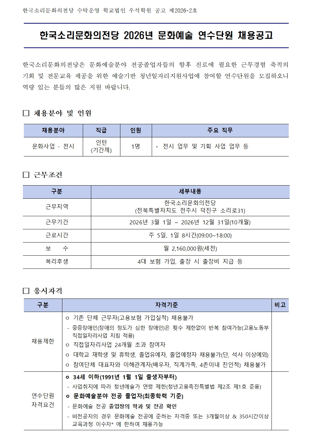 한국소리문화의전당 2026년 문화예술 연수단원 채용공고