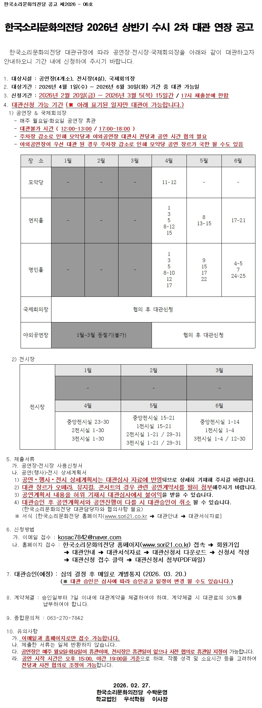 한국소리문화의전당 2026년 상반기 수시 2차 대관공고 연장